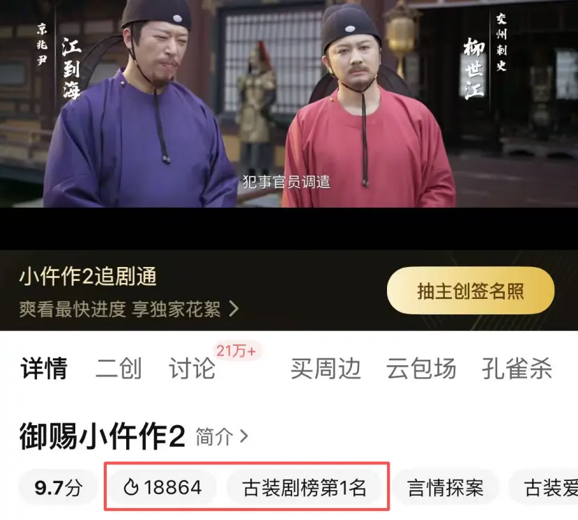 如今第二部播出,成绩果然没让人失望,仅播一晚热度破18000,并荣登平台榜单第一,展现出了“剧王”潜质,这下我彻底放心了!